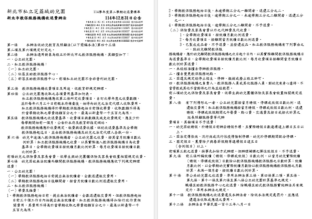 114學年度第二學期收退費標準